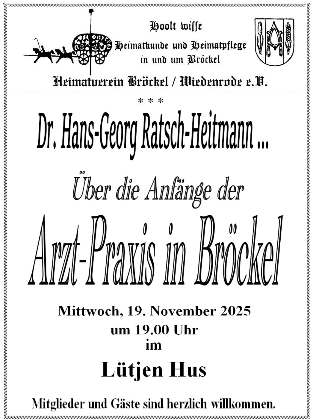 Heimatverein – Heimatabend Wann 19. November 2025 19:00 - 21:00 Zum Kalender hinzufügen ICS herunterladen Google Kalender iCalendar Office 365 Outlook Live Wo Lüttjes Hus Bahnhofsstr. 4, Bröckel, Niedersachsen, 29356 Karte nicht verfügbar