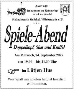 Spieleabend – Heimatverein Wann 24. September 2025 19:00 - 21:30 Zum Kalender hinzufügen ICS herunterladen Google Kalender iCalendar Office 365 Outlook Live Wo Lüttjes Hus Bahnhofsstr. 4, Bröckel, Niedersachsen, 29356 Karte nicht verfügbar