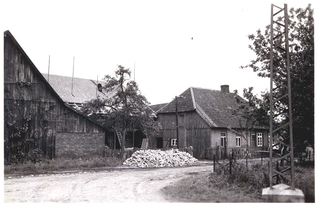 Im Jahr 1956 wurde ein Viehdoppelstall angebaut, die noch heute stehende Scheune kam im Jahr 1959 hinzu. An den nachfolgenden Lufbildern kann man erkennen, dass der Hof zur damaligen Zeit noch das einzige Haus zwischen der Genossenschaftsstraße und der Blumenstraße war. Hinter dem Haus war Ackerland, das von drei Pächtern bewirtschaftet wurde.